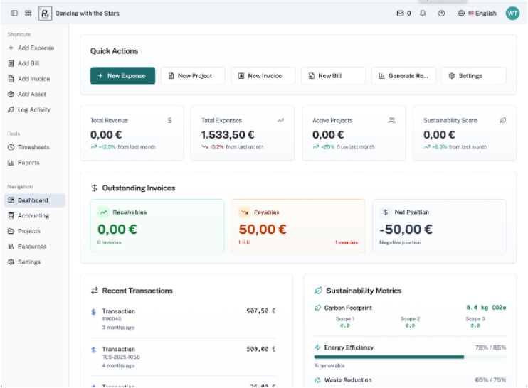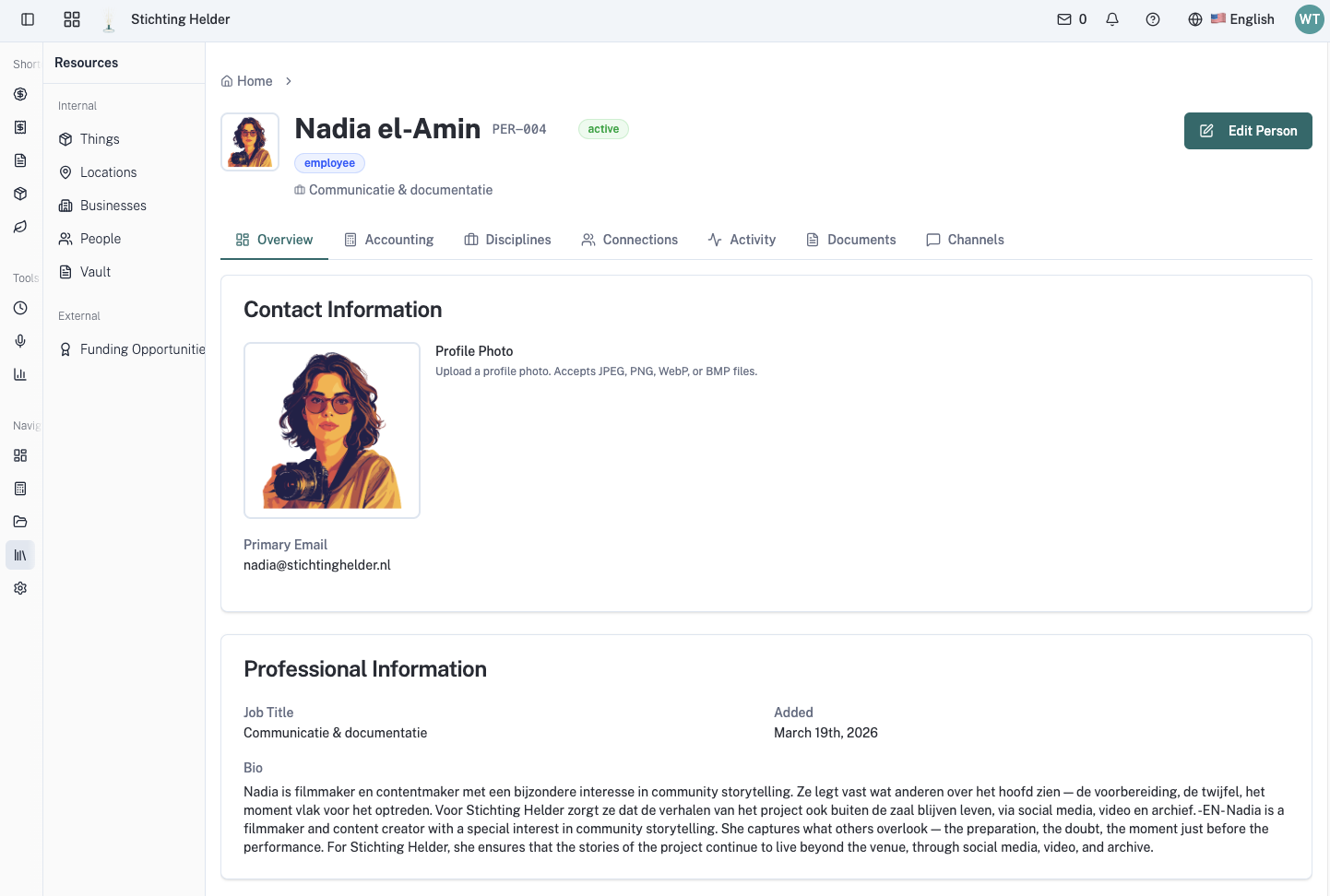 Real financial tools — not a spreadsheet, not a receipt folder. Chart of accounts, invoicing, budget tracking, grant allocation. Every transaction tied to a project, so you always know where the money went and why.